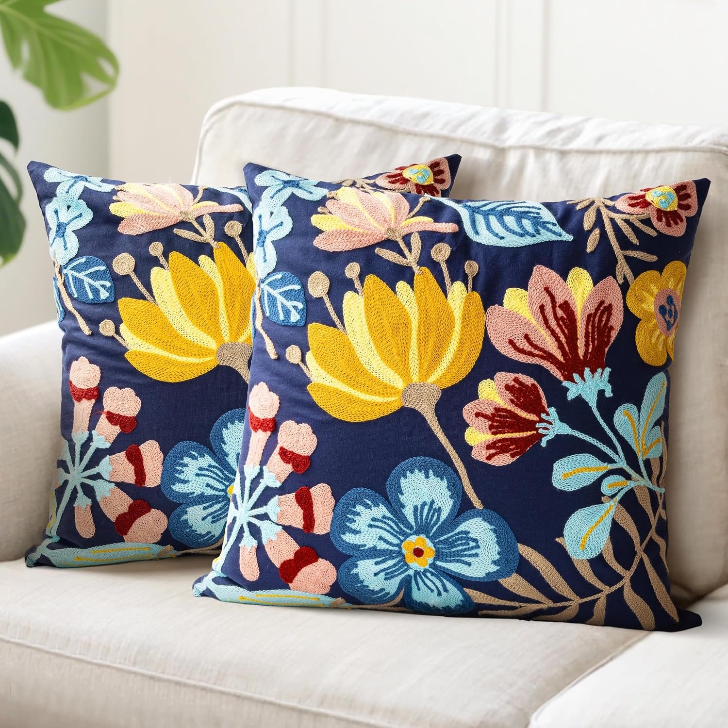 Embroidered Throw Pillow Covers 18″x18″ Set of 2, Boho Chic Modern Farmhouse Floral Cotton Cushion Covers for Couch, Sofa, Bed, and Living Room Decor – Blue Yellow Flower